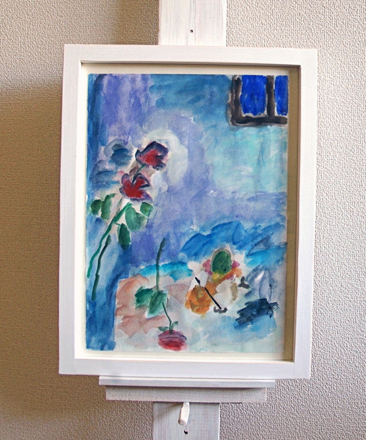 この絵の額装写真はまだないのですが、参考のために他の絵の額装画像を最後に載せておきました。自分の絵にはシンプルな額が似合うと思い、いつも市販の木を切ってペンキを塗って作っています。手作りゆえの良さも至らないところもありますが、どうぞご理解ください。もし額は無用、絵だけ購入したいという方はご連絡ください。