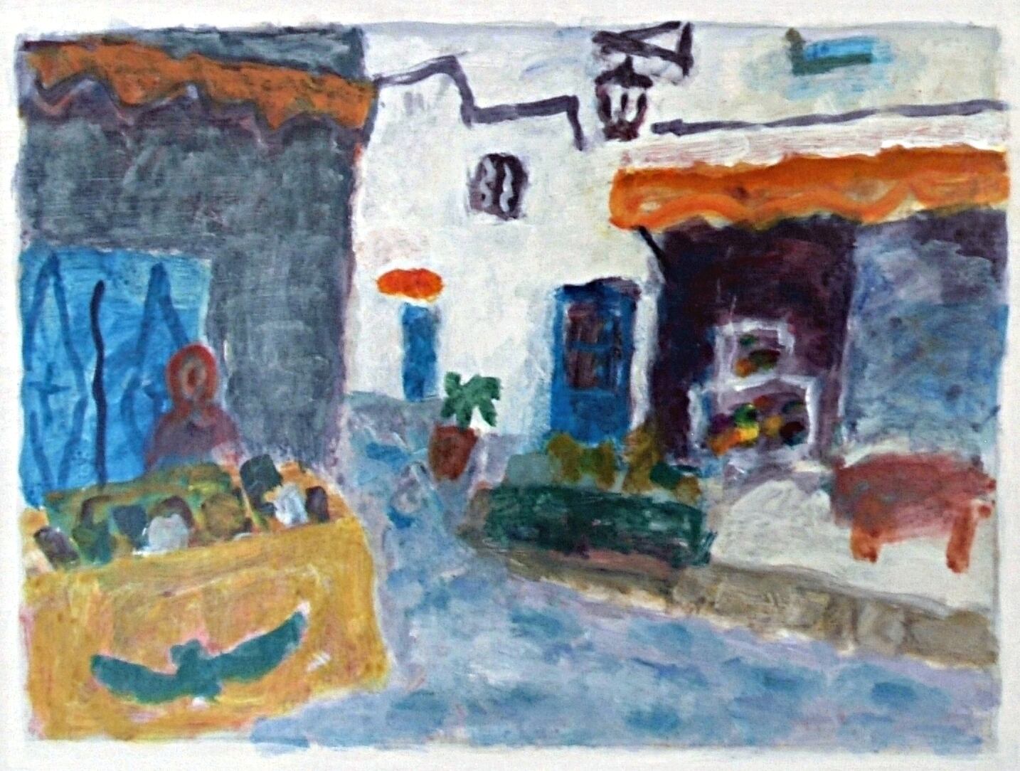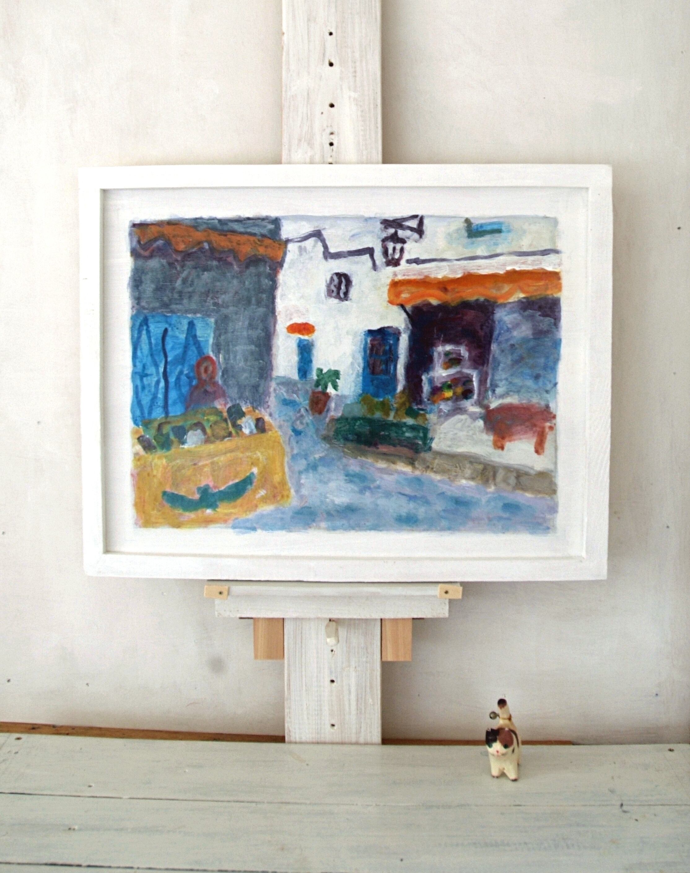モロッコ北部に位置するシャウエンという町の風景画。ブルーの家並みが美しい街です。このアクリル画は板に張り付けてニスを施してあり、アクリル板はつけていません。