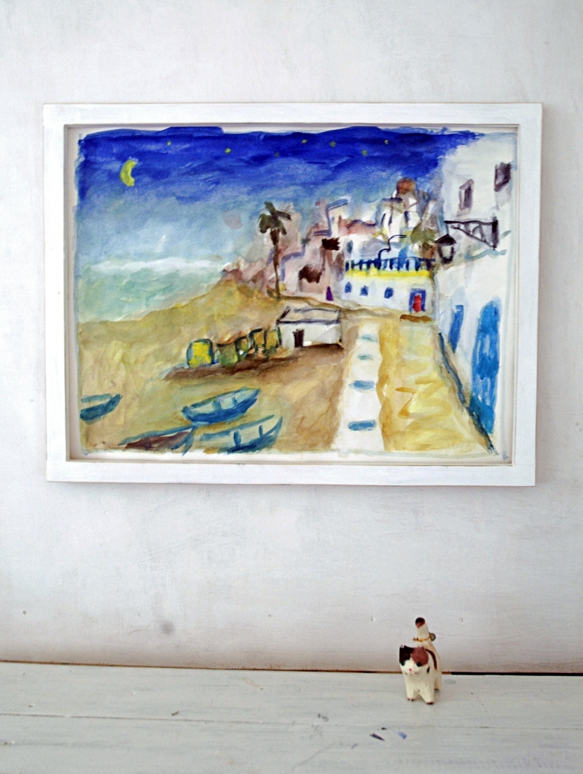 額は自作です。自分の絵にはシンプルな額が似合うと思って、いつも市販の木を切ってペンキを塗って作っています。手作りゆえの良さも至らないところもありますが、どうぞご理解ください。もし額は無用、絵だけ購入したいという方はご連絡ください。